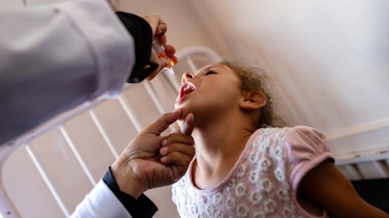 যুদ্ধের কারণে গাজার প্রায় ৯০ শতাংশ বাসিন্দা বাস্তুচ্যুত হওয়ায় স্বাস্থ্যসেবা ব্যবস্থা মারাত্মক চাপে পড়েছে এবং অনেক শিশুর নিয়মিত টিকাদান ব্যাহত হয়েছে। জাতিসংঘের ইউনিসেফ সংস্থা ইসরায়েলের সঙ্গে সহযোগিতায় গাজায় ১৩ লাখ ডোজ পোলিও টিকা এনেছে এবং আরও চার লাখ ডোজ শিগগিরই আসবে।
