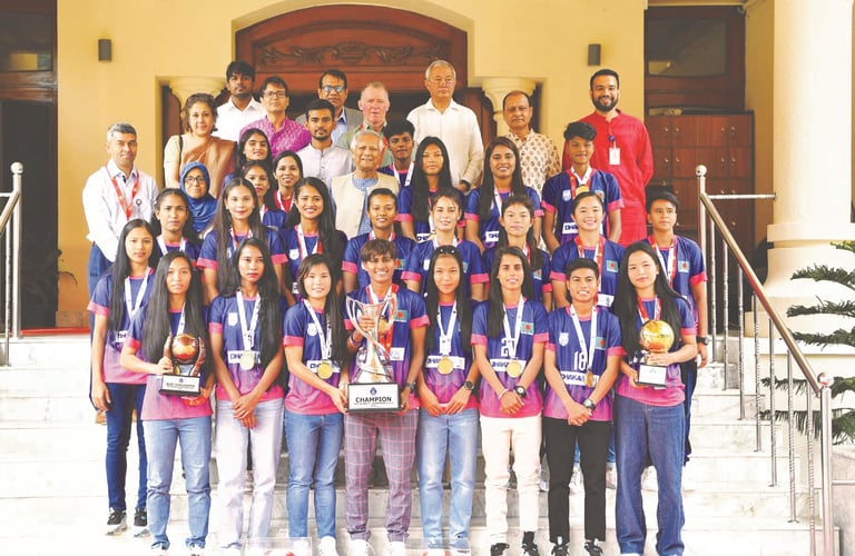 সাফজয়ী নারী ফুটবল দলকে সংবর্ধনা দিয়েছেন প্রধান উপদেষ্টা অধ্যাপক ড. মুহাম্মদ ইউনূস। শনিবার বেলা ১১টায় রাষ্ট্রীয় অতিথি ভবন যমুনায় এ সংবর্ধনার দেওয়া হয়। এর আগে, সকাল সাড়ে ১০টায় যমুনায় প্রবেশ করেন সাফ চ্যাম্পিয়নশিপ জেতা বাংলাদেশ নারী ফুটবল দলটি। নেপালে সাফ নারী চ্যাম্পিয়নশিপ ২০২৪ জিতে গত বৃহস্পতিবার দেশে ফিরেছে বাংলাদেশ নারী ফুটবল দল।