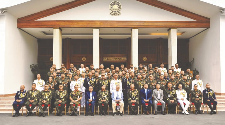 আক্রমণের বিরুদ্ধে জনগণকে নিজেদের রক্ষা করতে হবে- এটি পর্যবেক্ষণ করে অধ্যাপক ইউনূস বিশ্বের সরকারগুলোতে শান্তি মন্ত্রণালয় ও যুদ্ধ মন্ত্রণালয় উভয় মন্ত্রণালয়ই রাখার ওপর জোর দেন। তিনি প্রতিরক্ষা অ্যাটাশেসহ বৈদেশিক সম্পর্কে শান্তি অ্যাটাশে প্রবর্তনের পরামর্শ দেন। প্রধান উপদেষ্টা বলেন যে এটি আত্ম-ধ্বংসাত্মক গ্রহ। কেননা ‘আমরা শুধুমাত্র নিজেদের হত্যা করার জন্য প্রস্তুত সবকিছু করেছি।’ একটি উদাহরণ দিয়ে তিনি বলেন, মানুষ গ্রহ ধ্বংস করতে পরিবেশ ধ্বংস করছে। প্রতিদিন মানুষ গ্রহকে ধ্বংস করছে উল্লেখ করে তিনি বলেন, ‘আমরা একটি ভুল সভ্যতা তৈরি করেছি আত্মবিধ্বংসী সভ্যতা।’ প্রধান উপদেষ্টা অধ্যাপক ইউনূস তার বক্তব্যে এনডিসি ও এএফডবিøউসি কোর্সের সদস্যদের শুভেচ্ছা জানান এবং তাদের সাফল্য কামনা করেন।
