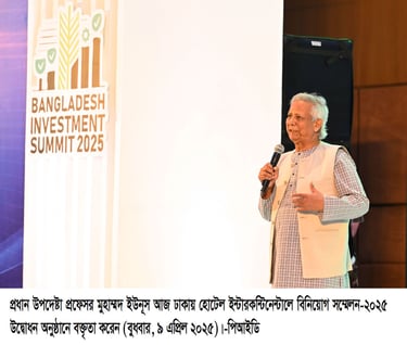 রাজধানীর হোটেল ইন্টারকন্টিনেন্টালে বুধবার 'বাংলাদেশ বিনিয়োগ সম্মেলন ২০২৫'-এর আনুষ্ঠানিক উদ্বোধনী অনুষ্ঠানে প্রধান অতিথির বক্তব্যে এসব কথা বলেন তিনি। অনুষ্ঠানের আয়োজন করে বাংলাদেশ বিনিয়োগ উন্নয়ন কর্তৃপক্ষ (বিডা)।