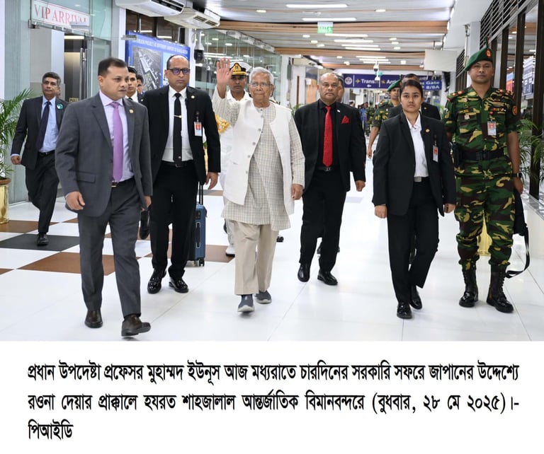 ঢাকা, ২৮ মে ২০২৫: অন্তর্বর্তীকালীন সরকারের প্রধান উপদেষ্টা অধ্যাপক মুহাম্মদ ইউনূস চারদিনের সরকারি সফরে জাপানের উদ্দেশে ঢাকা ত্যাগ করেছেন।