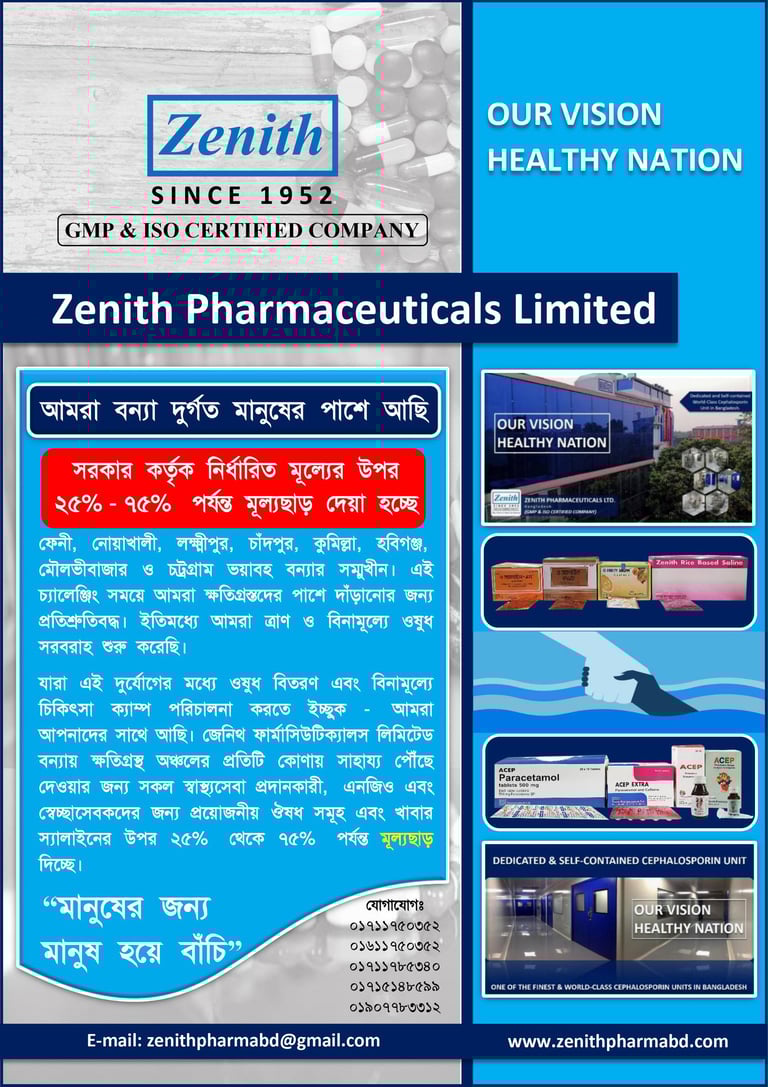 দুর্যোগে ওষুধ ও স্বাস্থ্যসেবা কার্যক্রমে সহযোগিতার আহ্বান: জেনিথ ফার্মার ২৫%-৭৫% মূল্যছাড়